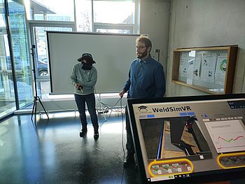 Nach einer kurzen Begrüßung durch Prof. Wesling konnten die 7 Teilnehmer am Schweißsimulator des ISAFs selbst Schweißnähte ziehen. Hier erlernten Sie, dass Schweißen schwerer ist, als es aussieht und, dass es zum Beispiel auf die genau richtige Geschwindigkeit beim Ziehen einer Schweißnaht ankommt.